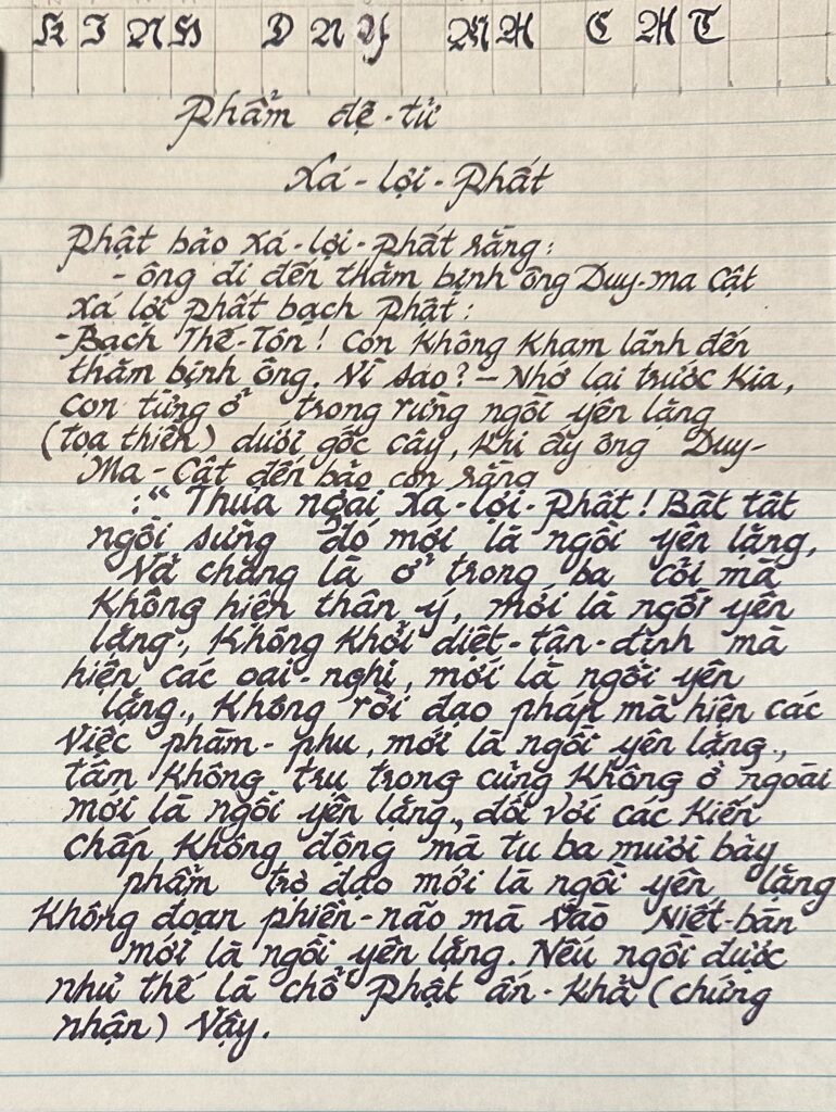 – Bạch Thế Tôn! Con không kham lãnh đến thăm bịnh ông. Vì sao? – Nhớ lại lúc trước kia, con từng ở trong rừng, ngồi yên lặng, (tọa thiền) dưới gốc cây, khi ấy ông Duy Ma Cật đến, bảo con rằng:, Thưa ngài Xá Lợi Phất! Bất tất ngồi sững đó, mới là ngồi yên lặng, vả chăng là ở trong ba cõi, mà không hiện thân ý, mới là ngồi yên lặng; không khởi diệt – tận – định, mà hiện các oai – nghi, mới là ngồi yên lặng; không rời đạo pháp, mà hiện các việc phàm – phu, mới là ngồi yên lặng; tâm không trụ trong, cũng không ở ngoài, mới là ngồi yên lặng; đối với các kiến chấp không động, mà tu ba mươi bảy phẩm trợ đạo, mới là ngồi yên lặng; không đoạn phiền – não, mà vào Niết-Bàn, mới là ngồi yên lặng. Nếu ngồi được như thế, là chỗ Phật ấn – khả, (chứng nhận) vậy.