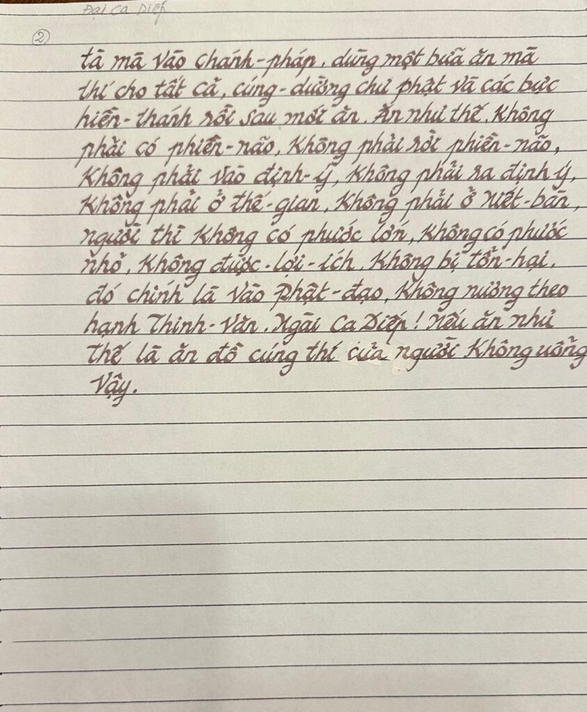 tà mà vào chánh-pháp, dùng một bữa ăn mà thí cho tất cả, cúng-dường chư Phật và các bực hiền-thánh rồi sau mới ăn. Ăn như thế, không phải có phiền-não, không phải rời phiền-não, không phải vào định-ý, không phải ra định ý, không phải ở thế-gian, không phải ở niết-bàn, người thì không có phước lớn, không có phước nhỏ, không được-lợi-ích, không bị tổn-hại, đó chính là vào Phật-đạo, không nương theo hạnh Thinh-văn. Ngài Ca Diếp! Nếu ăn như thế là ăn đồ cúng thí của người không uổng vậy.
