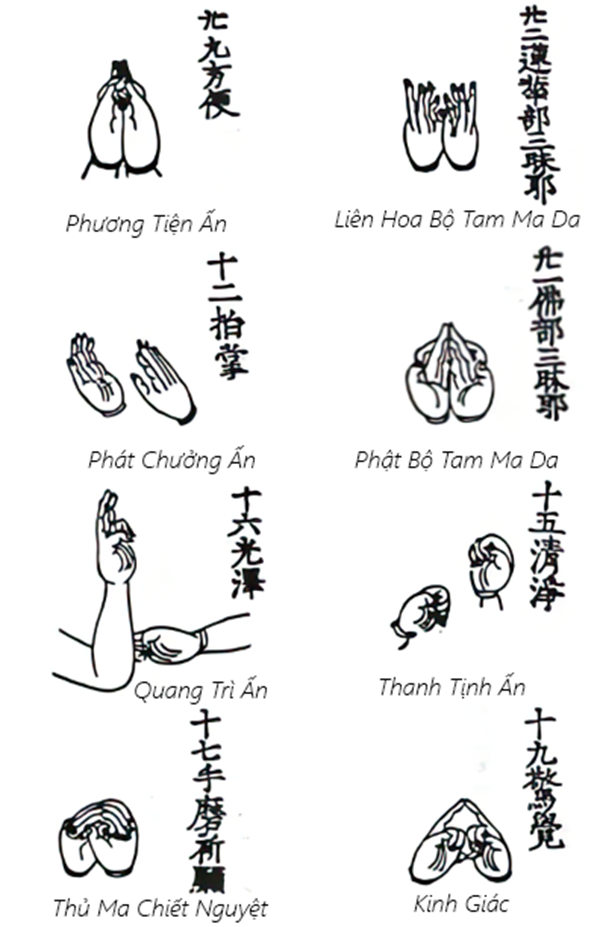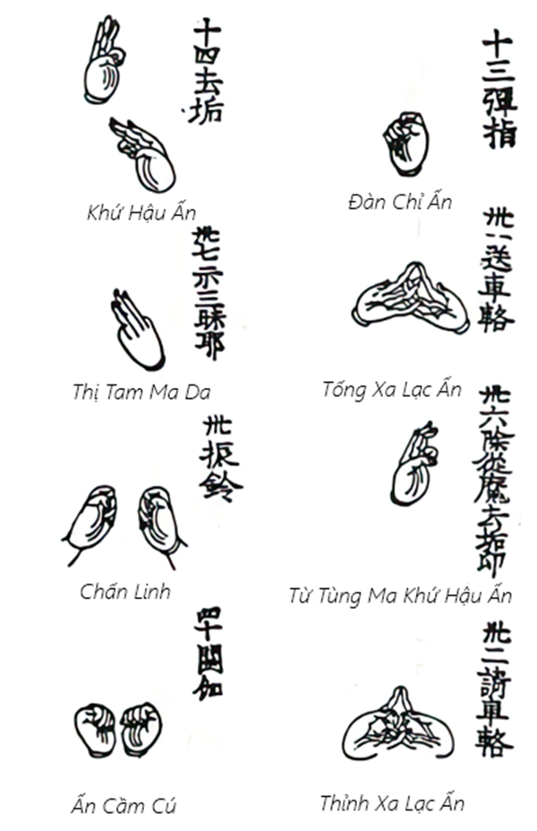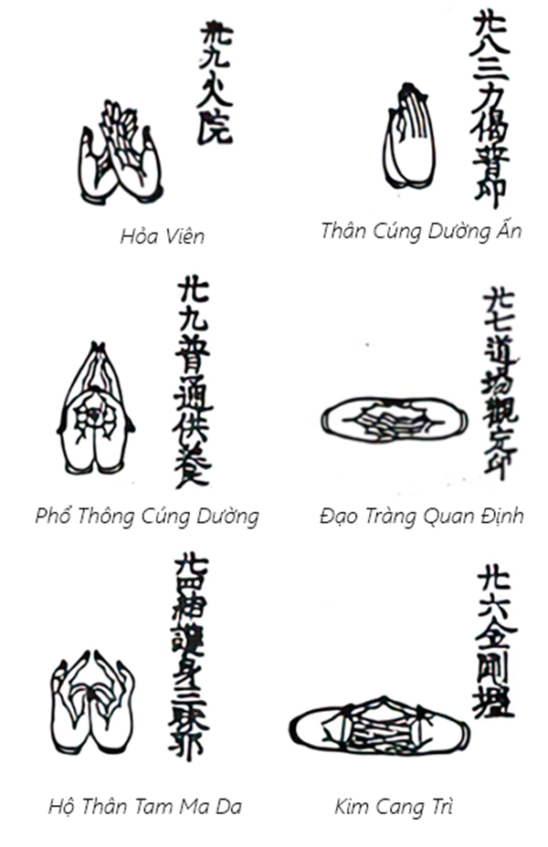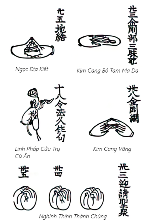 2. Pháp Ấn (MUDRA). Về thân, bàn tay bắt thành Pháp Ấn làm cho nhà Đạo mật tiếp với Phật Thánh và tạo được huyền năng pháp thuật mạnh mẽ vô cùng. Kẻ bắt tay Ấn cũng ví như thâu càn khôn[10] vào tay mình: Ngón cái chỉ về không gian. Ngón trỏ, hư không. Ngón giữa, lửa. Ngón áp út, nước. Ngón út chỉ về đất.