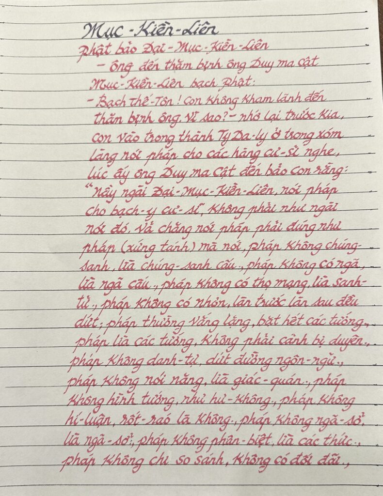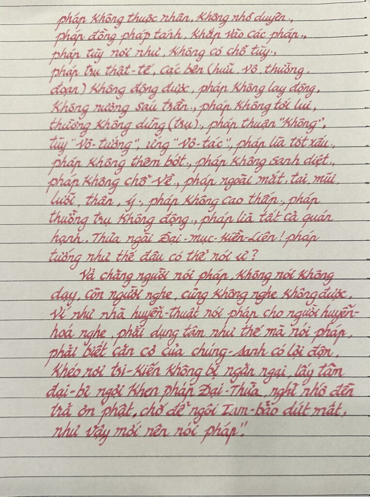 Nầy ngài Đại Mục Kiền Liên, nói pháp cho bạch-y-cư-sĩ, không phải như ngài nói đó. Vả chăng nói pháp phải đúng như pháp (xứng tánh) mà nói, pháp không chúng-sanh, lìa chúng-sanh cấu; pháp không có ngã, lìa ngã cấu; pháp không có thọ mạng, lìa sanh-tử; pháp không có nhơn, làn trước làn sau đều dứt; pháp thường vắng lặng, bặt hết các tướng; pháp lìa các tướng, không phải cảnh bị duyên; pháp không danh-tự, dứt đường ngôn-ngữ; pháp không nói năng, lìa giác-quán; pháp không hình tướng, như hư-không; pháp không hí-luận, rốt-ráo là không; pháp không ngã-sở, lìa ngã-sở; pháp không phân-biệt, lìa các thức; pháp không chi so sánh, không có đối đãi;