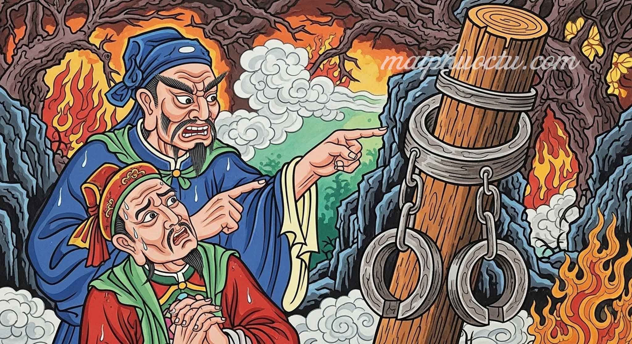 Hai vợ chồng xuống âm phủ, bả giấu ổng trong nhà bếp, nhưng ổng muốn đi coi mấy nơi mà người trần bị xử tội sau khi chết. Bả dắt ổng tới một nơi, ở đó có cái gông bự tổ chảng. Ổng biểu vợ dắt đi gặp phán quan hỏi, cái gông đó sao chưa xài. Quan nói: